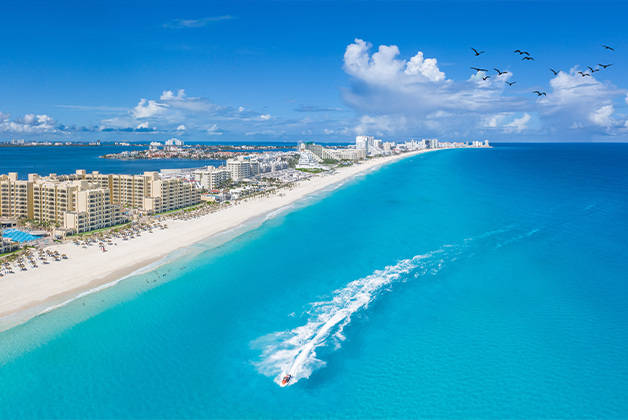 Cancun is known for its variety of resorts with white sands, vibrant nightlife, and accessibility from the United States. Nature lovers can explore nearby jungles and cenotes, stunning white sand beaches, and exceptional snorkeling in turquoise waters.